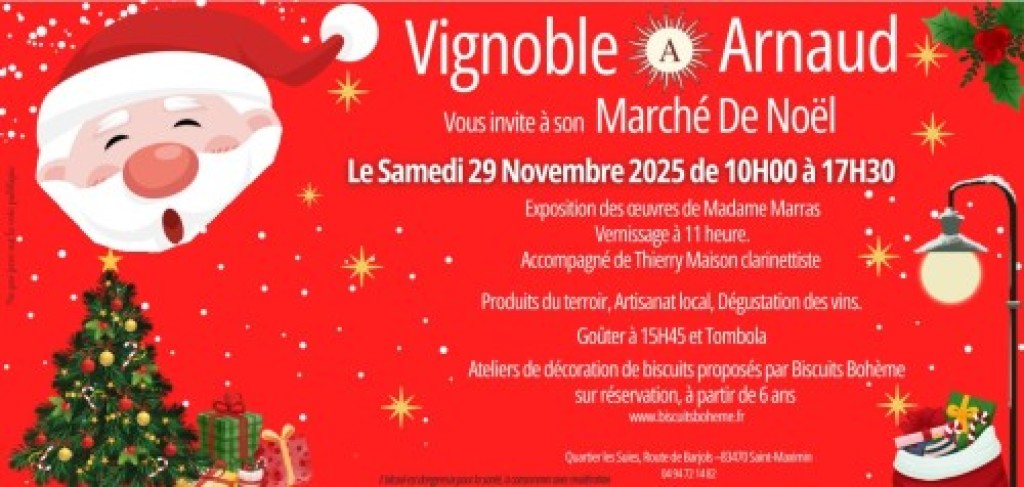 “ La magie de Noël s'invite au Vignoble Arnaud avec des produits du terroir, de l'artisanat local, une dégustation des vins, un atelier de décoration de biscuits de Noël, un goûter suivi d'une tombola ”