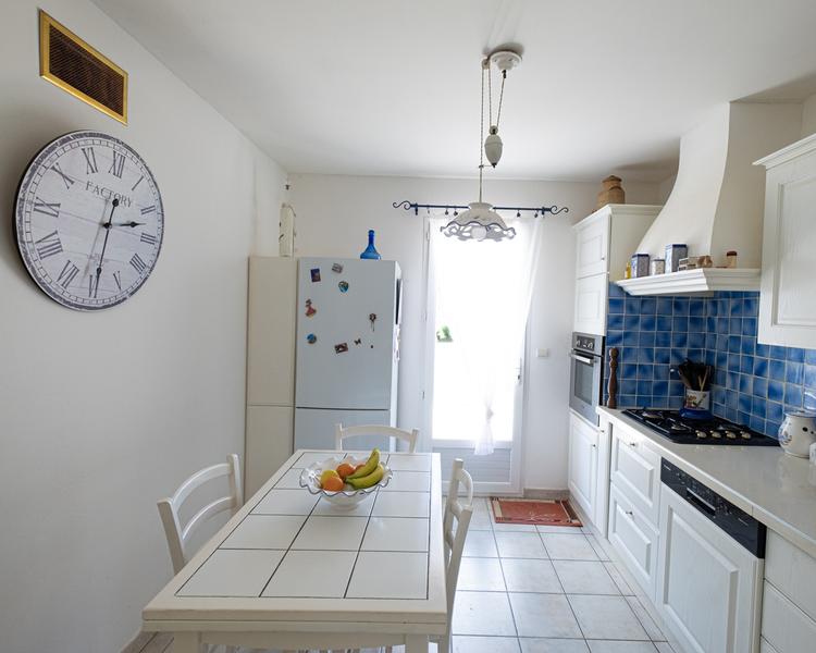 La maison est équipée d'un salon salle à manger de 43m² attenant à une petite cuisine donnant sur une terrasse de 80m² où se trouvent tout le nécessaire pour les repas.