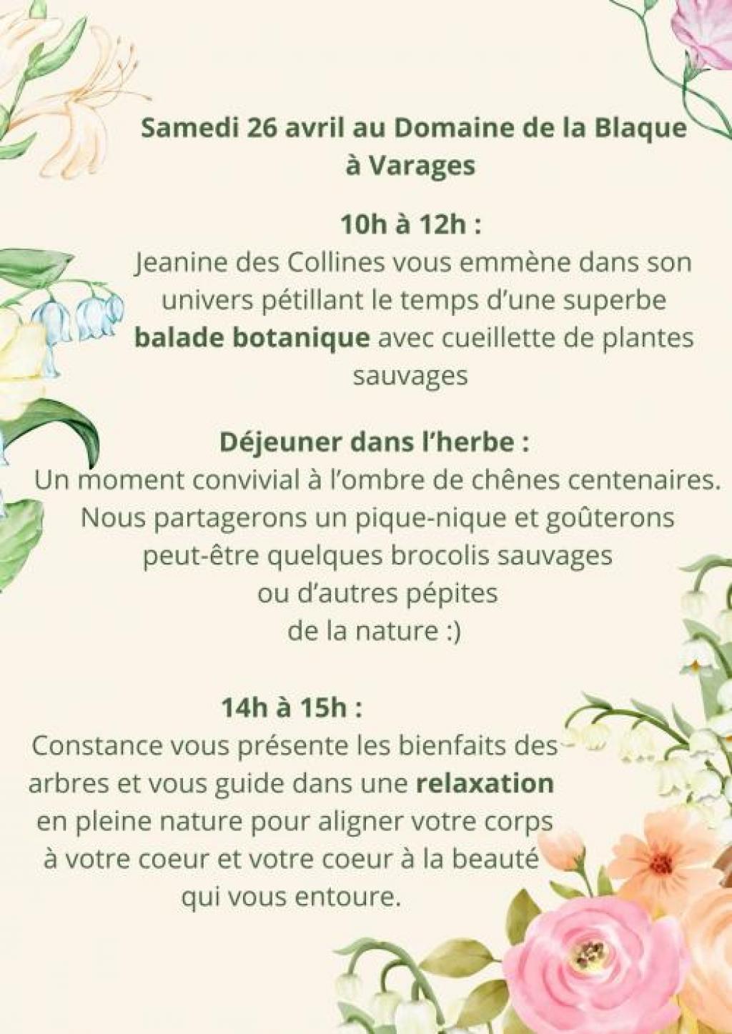 “ une balade botanique avec cueillette de plantes sauvages vous est proposée. Elle sera suivie d'un déjeuner dans l'herbe. ”
