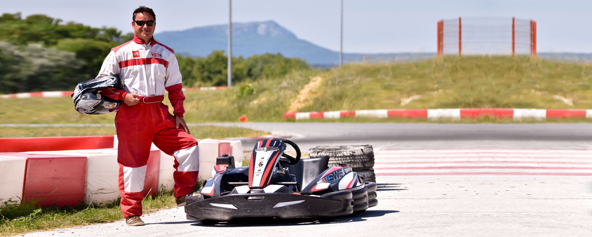 Je suis vêtu d'une superbe combinaison rouge et blanche et d'un casque intégral. J'ai l'impression d'être un pilote de Formule 1 dans cet accoutrement. Heureusement que le karting est à l'air libre, car il fait une chaleur abominable dans cet équipement.