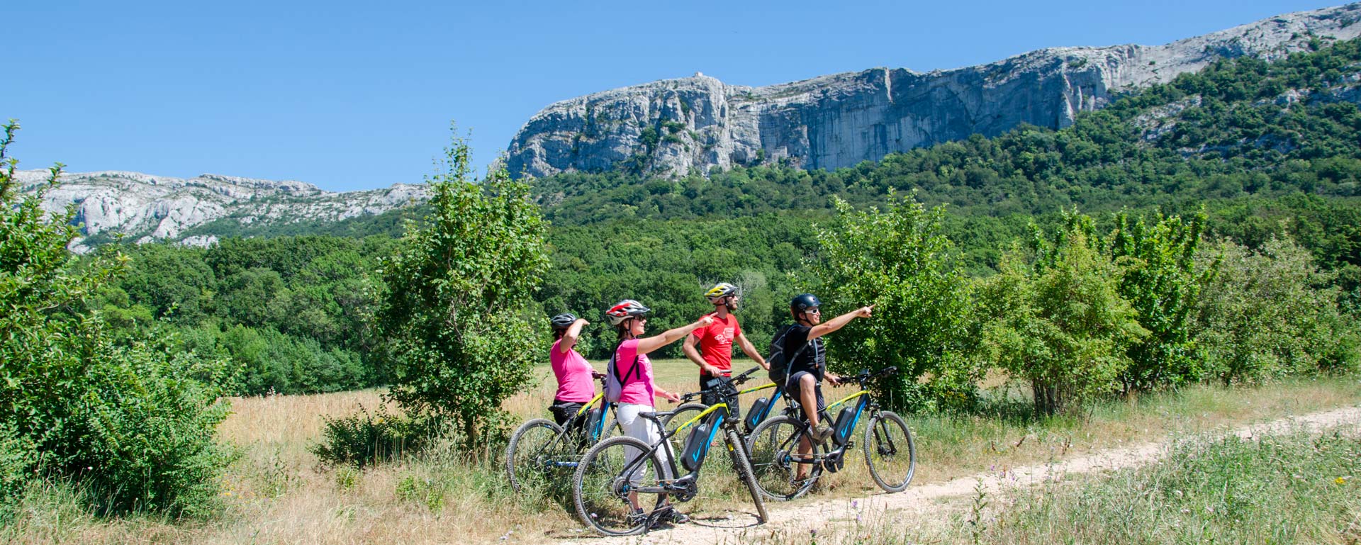 Une longue descente sur un large chemin accidenté nous emmène au pied du massif de la Sainte Baume. La deuxième moitié du parcours est en sous-bois ombragé. Le chemin est en terre avec peu de pierres. Les paysages aux alentours sont à couper le souffle. Les filles, qui ont mis un petit temps à s'adapter, commencent à s'amuser : elles configurent leurs VTT électriques en mode sport et commencent à nous doubler.